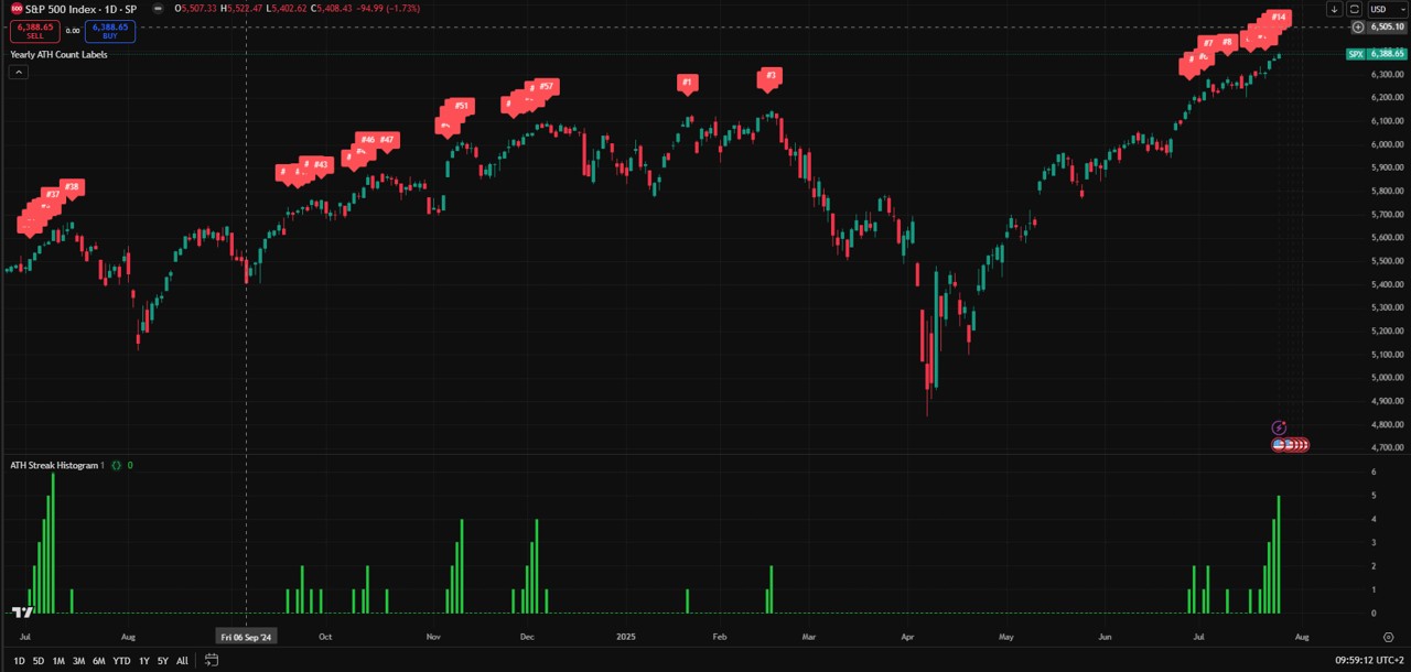 La scorsa settimana ha visto ancora una volta Wall Street dominare la scena. L’S&P 500 ha aggiornato nuovi massimi per cinque sedute consecutive - una serie che mancava da luglio 2024 - portando a 14 il numero di nuovi record segnati nel 2025, nove dei quali solo a luglio. Il Nasdaq 100 ha chiuso venerdì con il suo quindicesimo massimo storico annuale, mentre il Dow ha superato quota 44.900. Anche il Russell 2000 ha tenuto, confermando un clima di rischio ancora costruttivo.