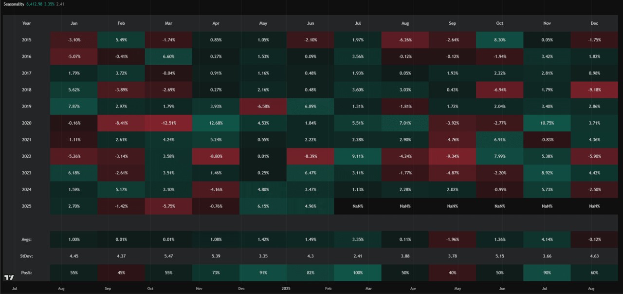 A rafforzare questo scenario contribuisce anche la stagionalità. Dal 2015 a oggi, luglio è l’unico mese sempre positivo per lo S&P 500, con una performance media del +3,35% e una volatilità storica tra le più basse dell’anno. Quest’anno non ha fatto eccezione: con il +2,96% registrato finora, il mese si sta muovendo in linea con il suo profilo storico. Ma proprio questa apparente regolarità può diventare un’arma a doppio taglio: agosto, ma soprattutto settembre sono statisticamente tra i mesi peggiori dell’anno, con performance medie negative e frequenza di correzioni superiore alla norma.