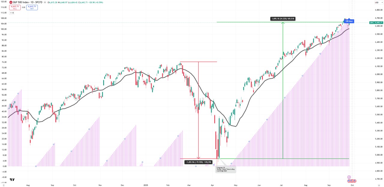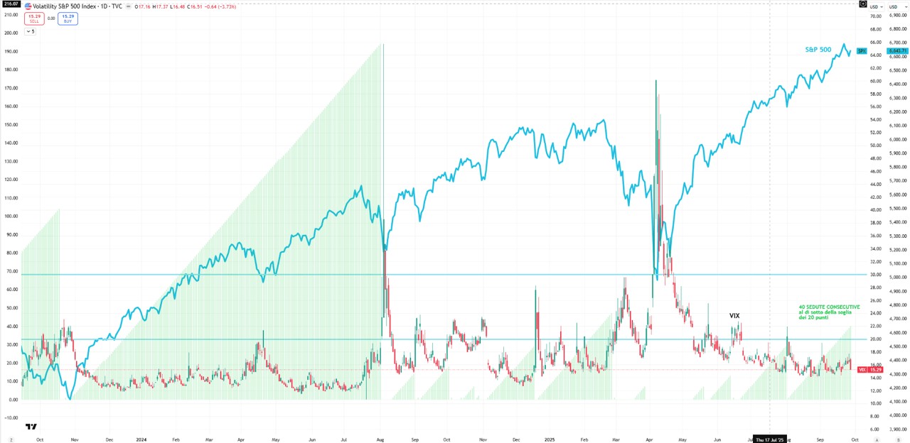 Lo S&P 500 ha inanellato 108 sedute consecutive senza due chiusure di fila sotto la media mobile a 20 giorni, un record che non si vedeva dal gennaio 2018. Dal minimo del 7 aprile l’indice ha guadagnato circa il 35%, toccando 25 nuovi massimi storici, 28 da inizio anno. Nelle ultime 39 sedute non si è mai verificata una correzione dal massimo più recente pari o superiore al 2%, una sequenza che non si vedeva dal luglio 2024.