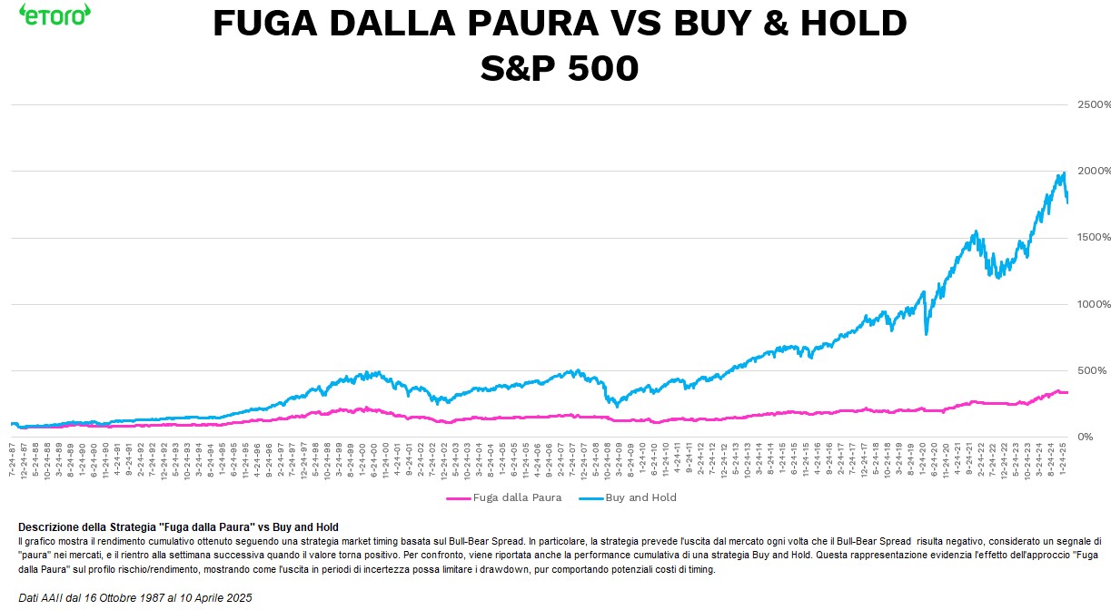 Il 9 aprile ne abbiamo avuto la prova: chi era fuori dal mercato ha perso in una sola seduta quanto avrebbe impiegato mesi a recuperare. E non è un’eccezione. Il grafico qui sotto lo mostra bene: confronta due strategie di lungo periodo sull’S&P 500. Da una parte, il classico Buy & Hold. Dall’altra, un approccio di market timing basato sul sentiment degli investitori, che chiameremo “Fuga dalla Paura”.