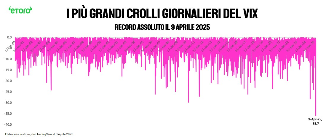 Il VIX si sgretola. La volatilità si è liquefatta. Il VIX è ieri crollato del 35,72%, da 50,98 a 33,63 punti (ancora alto). È il più ampio calo giornaliero nella storia dell’indice. Una reazione emotiva, più che razionale. La tregua è iniziata. Ma non è detto che duri.