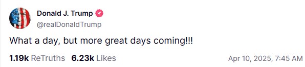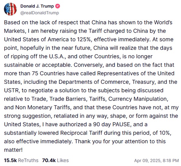 Due ore dopo, alle 18:18, arriva l’annuncio ufficiale: Tariffe contro la Cina portate immediatamente al 125%, tregua di 90 giorni sui dazi reciproci per i Paesi non ostili, e riduzione al 10% delle tariffe medie sugli altri fronti, esclusi auto, acciaio e alluminio.