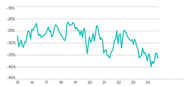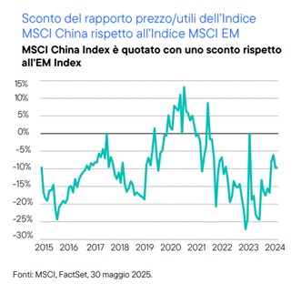Dopo un prolungato periodo di disaffezione verso l’azionario cinese, si osserva un rinnovato interesse, favorito da valutazioni divenute più interessanti. L’Indice MSCI China ha sovraperformato il paniere più ampio dei mercati emergenti nel 2024, pur continuando a scambiare con uno sconto rispetto ai principali peer EM. Le aspettative di crescita più contenuta e le persistenti tensioni geopolitiche giustificano, a nostro avviso, parte di tale sconto valutativo.