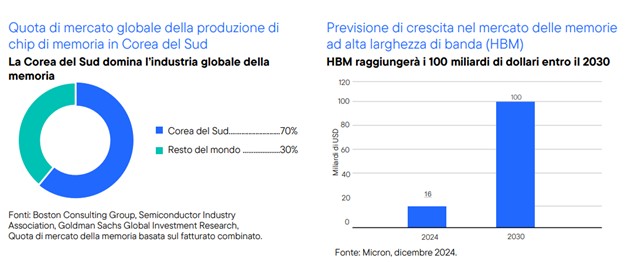 Il mercato globale dei semiconduttori di memoria dovrebbe raggiungere un valore di circa 250 miliardi di dollari entro il 2030,9 con una crescita trainata dalla domanda di soluzioni ad alta capacità di applicazioni AI. La Corea del Sud è anche leader nel segmento della memoria ad alta larghezza di banda (HBM), componente fondamentale delle unità di elaborazione grafica (GPU) utilizzate nei sistemi di intelligenza artificiale. Secondo le stime, il mercato HBM crescerà a un tasso annuo del 30% fino al 2030, raggiungendo un valore potenziale di circa 100 miliardi di dollari.10
