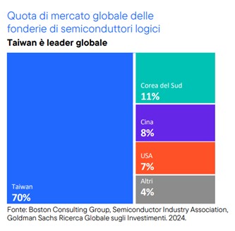 Taiwan è leader globale nel settore delle fonderie di semiconduttori logici. Questo comparto si colloca al centro della rivoluzione dell’intelligenza artificiale, beneficiando della forte crescita della domanda di chip AI destinati ai data center su scala mondiale. Oltre all’AI, i semiconduttori rappresentano componenti essenziali in una vasta gamma di settori, tra cui elettronica di consumo, automotive e elettrodomestici