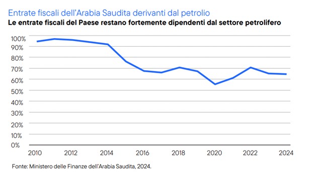 Uno dei principali elementi di attrattività dei mercati emergenti per gli investitori è la rapida espansione della classe media. Questo tema è consolidato in mercati come Cina e India, e sta assumendo crescente rilevanza anche in Arabia Saudita. Negli ultimi anni, i decisori politici sauditi hanno avviato un processo di liberalizzazione e riforma, in linea con quanto già osservato in altri mercati emergenti. Oltre alle riforme del mercato del lavoro, sono state introdotte misure di apertura agli investimenti diretti esteri, riforme fiscali e un significativo potenziamento delle infrastrutture turistiche. Sebbene tali interventi abbiano contribuito a ridurre la vulnerabilità del Paese alle oscillazioni dei prezzi energetici, il rischio non è stato del tutto eliminato. Le implicazioni dei prezzi del petrolio restano rilevanti per l’Arabia Saudita, considerando l’elevata incidenza del settore oil & gas sul PIL e il fatto che nel 2024 il 62% delle entrate fiscali del governo proveniva dal petrolio.Manteniamo un approccio prudente nei confronti dell’Arabia Saudita, alla luce della sua persistente dipendenza dai prezzi del greggio per sostenere la crescita economica.