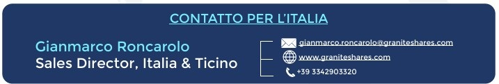 Le presenti informazioni sono fornite da Premium Catara Capital – Empresa de Investimento, S.A. ("Catara Capital"), una società regolamentata con il numero di registrazione 419 dalla Commissione per il Mercato dei Valori Mobiliari Portoghese (CMVM). Materiale di marketing riservato esclusivamente a clienti professionali. Prima di investire, si prega di leggere il prospetto, il KID e le condizioni definitive dei prodotti. Non vi è alcuna garanzia che gli obiettivi di rendimento, se dichiarati, saranno raggiunti. Questa e-mail e i documenti allegati hanno scopo puramente informativo e non devono costituire una base per l'investimento. Nulla di quanto contenuto in questa e-mail e nei relativi allegati costituisce una consulenza professionale e/o finanziaria, né costituisce una dichiarazione esaustiva o completa degli argomenti trattati. Nel fornire tali informazioni in questa fase, Catara Capital non garantisce né si assume alcuna responsabilità per la loro accuratezza o completezza. I risultati storici non sono garanzia di rendimenti futuri. Nulla di quanto contenuto in questa e-mail e nei documenti allegati è inteso, né deve essere interpretato come, la creazione di alcun rapporto legale o contrattuale. Né le informazioni né le opinioni espresse nella presente e-mail e nella documentazione allegata costituiscono una sollecitazione o un'offerta da parte di Catara Capital ad acquistare o vendere titoli o altri strumenti finanziari o a fornire Servizi. I titoli ETP sono emessi in base a un prospetto di base, disponibile all'indirizzo https://graniteshares.com/europe/etps/, e approvato dalla Central Bank of Ireland.