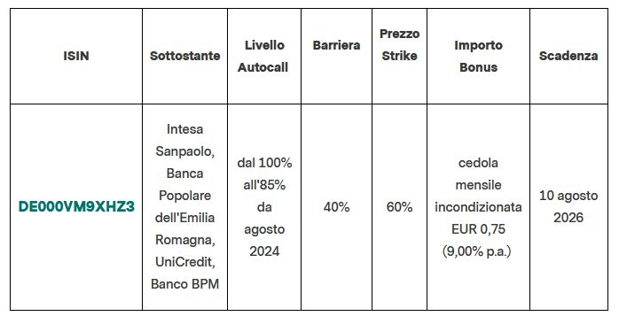 Il prodotto offre, inoltre, premi mensili incondizionati dello 0,75% (9,00% annuo), possibilità di Autocall a partire dal sesto mese (agosto 2024) con Livello Autocall decrescente dal 100% all’85%. La durata è di 2 anni e mezzo con scadenza prevista per il 10 agosto 2026.