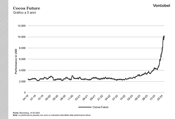 Il trend in salita delle quotazioni del cacao sembra essere inarrestabile. A febbraio, i futures del cacao si aggiravano intorno ai seimila dollari per tonnellata dai 2.500 dollari dell’anno prima. Da allora, i prezzi sono schizzati in alto, stabilendo nuovi massimi quasi ogni giorno. I contratti futures con scadenza a maggio hanno raggiunto un massimo intraday di 10.080 dollari per tonnellata. Solo questo mese, il prezzo del cacao è aumentato del 53,75%, mentre dall'inizio dell'anno ha accumulato un incremento di quasi il 130%. Questi dati indicano che il cacao sta diventando ancor più prezioso del rame.