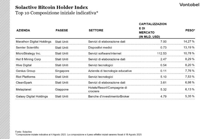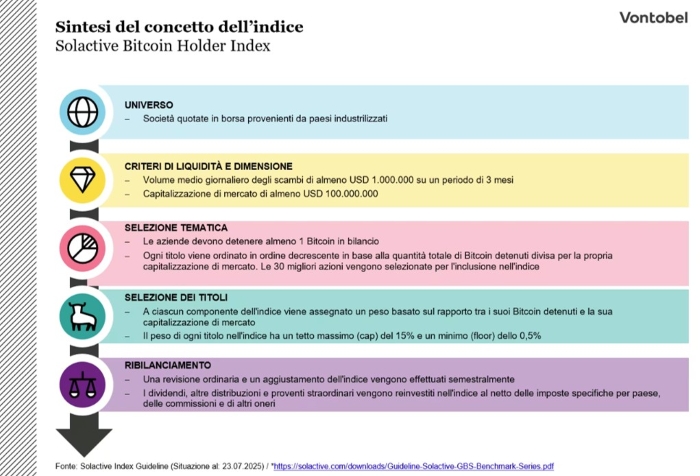 Vontobel Markets 21 ago 2025 | 7 Minuti di letturaLe criptovalute, soprattutto la più rappresentativa Bitcoin, non sono più oggetto di attenzione solo da parte del grande pubblico. La fiducia nella moneta digitale sta crescendo anche nelle aziende, nei fondi e tra gli investitori istituzionali. Le singole aziende stanno integrando il Bitcoin nei loro bilanci come riserva strategica, invece di detenere la loro liquidità esclusivamente in valute o classi di attività tradizionali. L'obiettivo è utilizzare il Bitcoin come riserva di valore e partecipare alla sua ulteriore affermazione per creare un potenziale valore aggiunto a lungo termine. In collaborazione con il fornitore di indici Solactive, Vontobel ha sviluppato il Bitcoin Holder Index, che consente agli investitori di partecipare all'andamento dei prezzi delle società che detengono strategicamente Bitcoin.