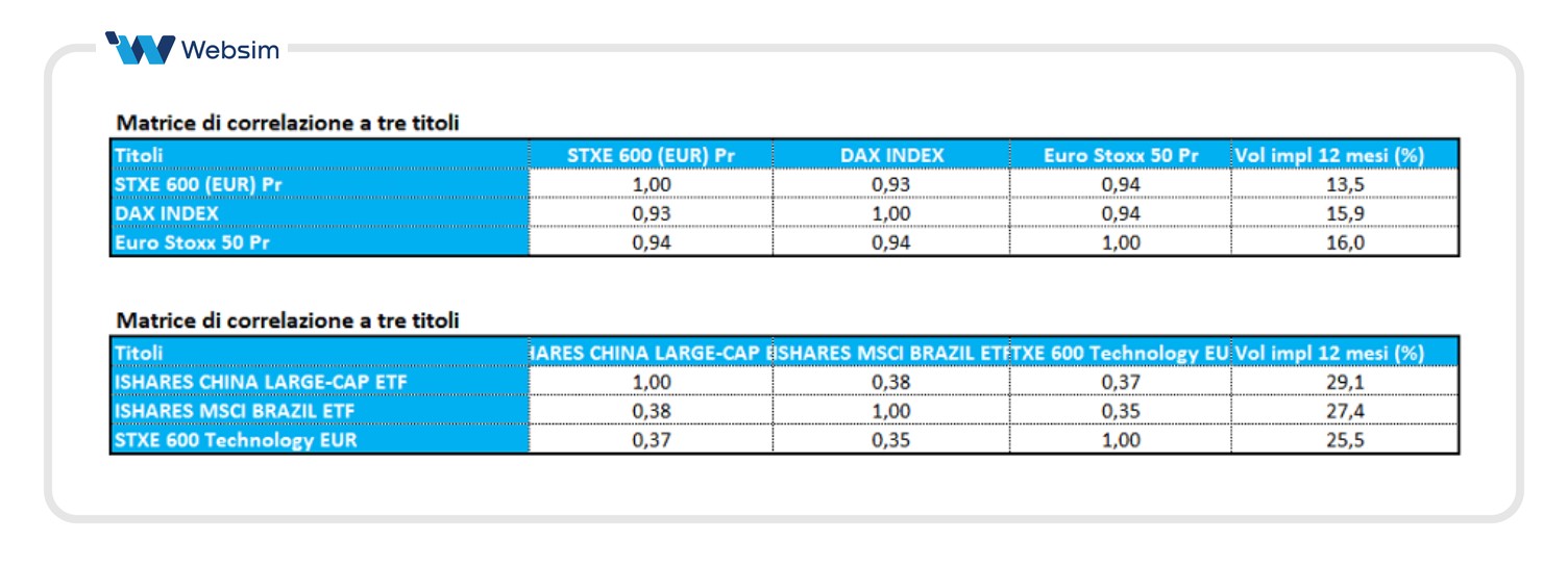 Il secondo invece all’opposto con Stoxx Europe 600 Technology, iShares China Large Cap ETF e iShares MSCI Brazil ETF. Nell’immagine sotto avete volatilità e correlazione. Il primo basket evidenzia una correlazione altissima, pari allo 0,93, mentre il secondo molto bassa, pari allo 0,35. Ben differenti anche le volatilità.
