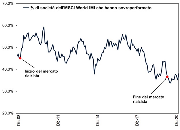 Fonte: FactSet, all'11/02/2025. Percentuale di componenti dell'indice MSCI World IMI che superano i rendimenti dell'indice MSCI World IMI su 12 mesi con dividendi netti in euro, dal 31/12/2008 al 31/12/2020. Valori espressi in euro.