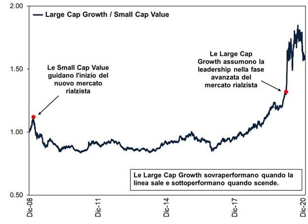 Fonte: FactSet, all'11/02/2025. Rendimento dell'indice MSCI World Large Cap Growth e Small Cap Value con dividendi netti in euro, dal 31/12/2008 al 31/12/2020. Valori espressi in euro.