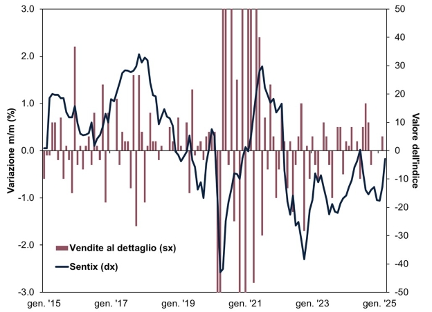 Figura 1: Vendite al dettaglio nell’Eurozona e indice economico Sentix