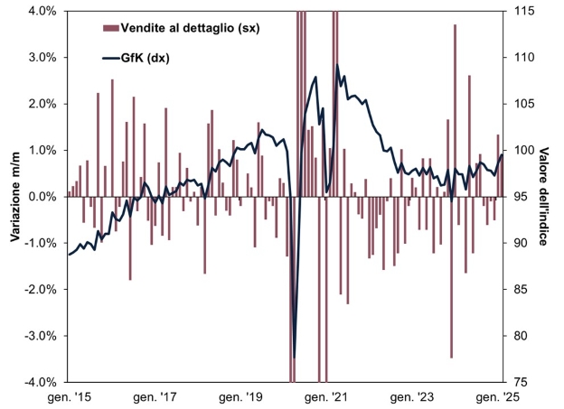 Fonte: FactSet, al 14/04/2025. Asse Y delle vendite al dettaglio troncato a 4,0 e -4,0 a causa di estremi legati ai lockdown che renderebbero il grafico incomprensibile.