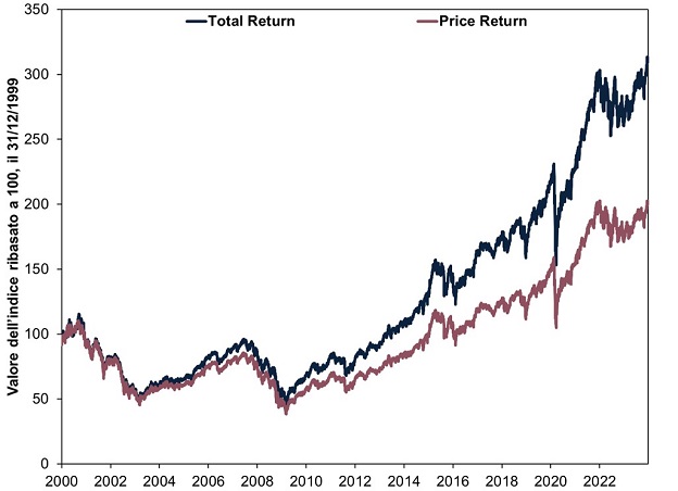 Fonte: FactSet, al 15/10/2024. Indice MSCI World, rendimento dividendi esclusi e rendimento con dividendi netti (total return), dal 31/12/1999 al 31/12/2023. Valori espressi in euro