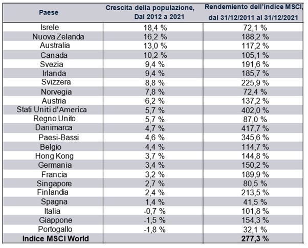 Fonte: World Data Info e FactSet, al 14/04/2023. Crescita cumulata della popolazione e rendimenti cumulati dell’indice MSCI con dividendi netti in EUR, dal 31/12/2011 al 31/12/2021.