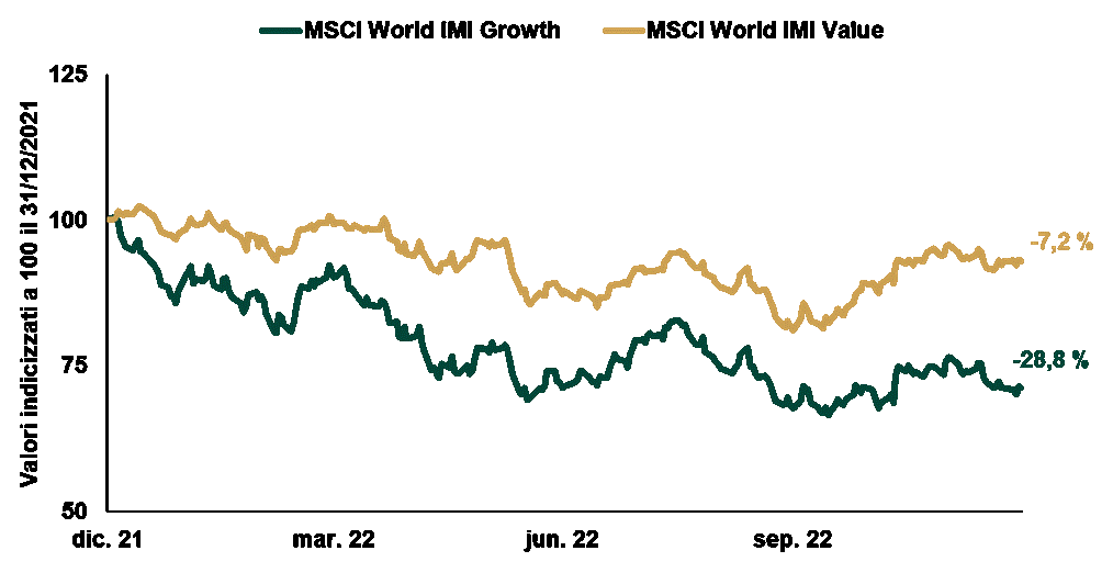 Fonte: FactSet, al 02/02/2023. Indici MSCI World Growth e MSCI World Value (dividendi netti inclusi), dal 31/12/2021 al 30/12/2022. Valori espressi in dollari USA. Valori indicizzati a 100.