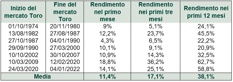 Per quanto difficile possa essere, Fisher Investments Italia sa che restando investiti nel mercato è possibile partecipare al forte rimbalzo iniziale che accompagna l’avvio di un nuovo mercato rialzista. Questo rimbalzo arriva di solito quando gli investitori meno se lo aspettano e può essere importante per il successo degli investimenti a lungo termine. È essenziale cogliere la maggior parte possibile del rendimento iniziale del mercato rialzista per un ottimo motivo. In media, quasi la metà del rendimento del primo anno di ciascun mercato Toro si concentra nei primi tre mesi. Come mostra la Figura 3, il rendimento nei primi tre mesi supera in media il 17%. La mancata partecipazione a questi grossi rendimenti iniziali può comportare un enorme costo-opportunità per il portafoglio di un investitore.