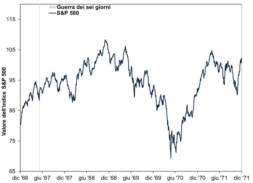 Andando ancora più indietro, la Figura 3 mostra la performance dei titoli azionari in occasione della Guerra dei Sei Giorni del 1967.